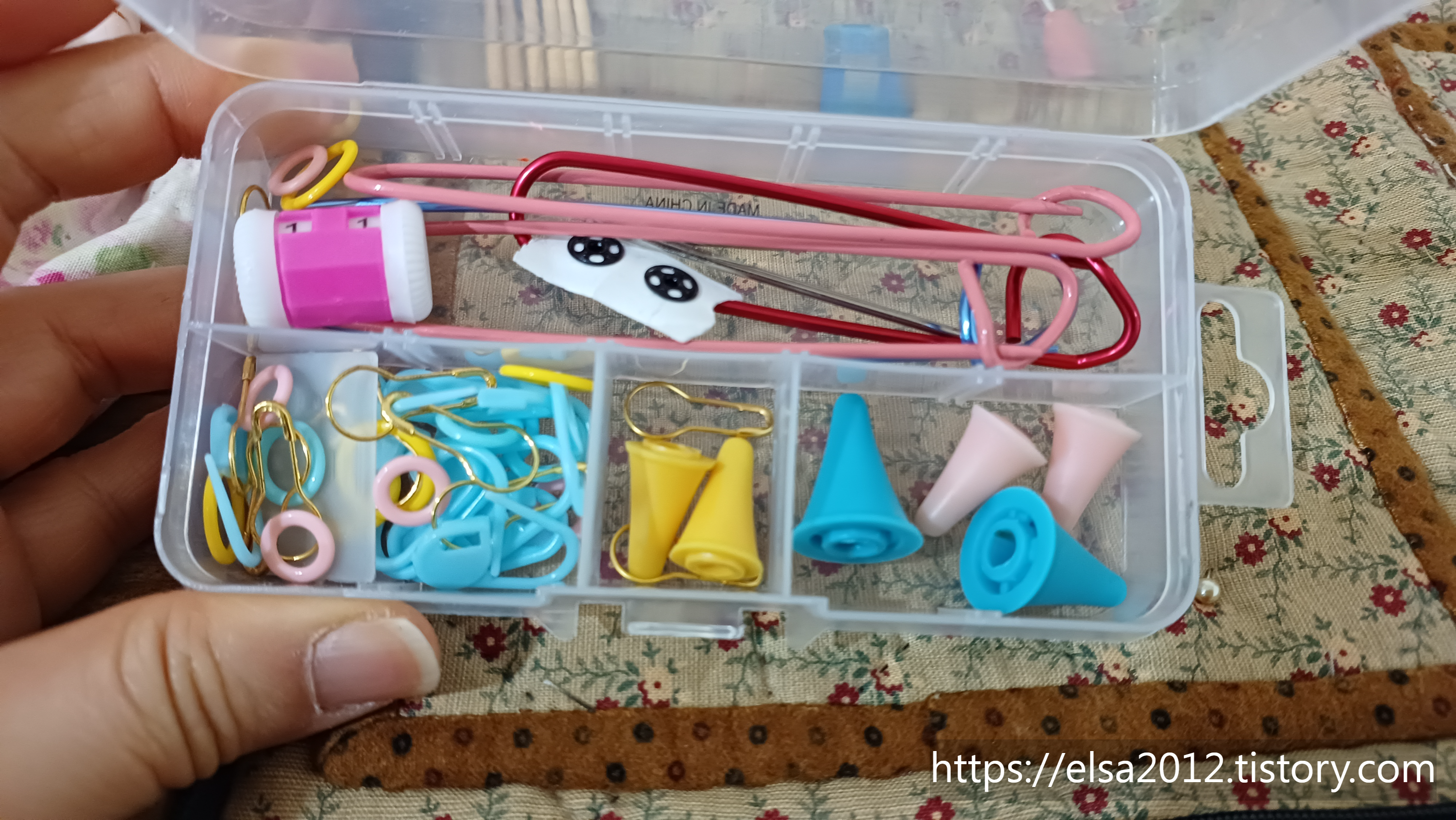 통 안에 보면 안전핀과 단수, 코 수 링 그리고 바늘마개, 똑딱 핀, 단수 카운터가 들어있어요.