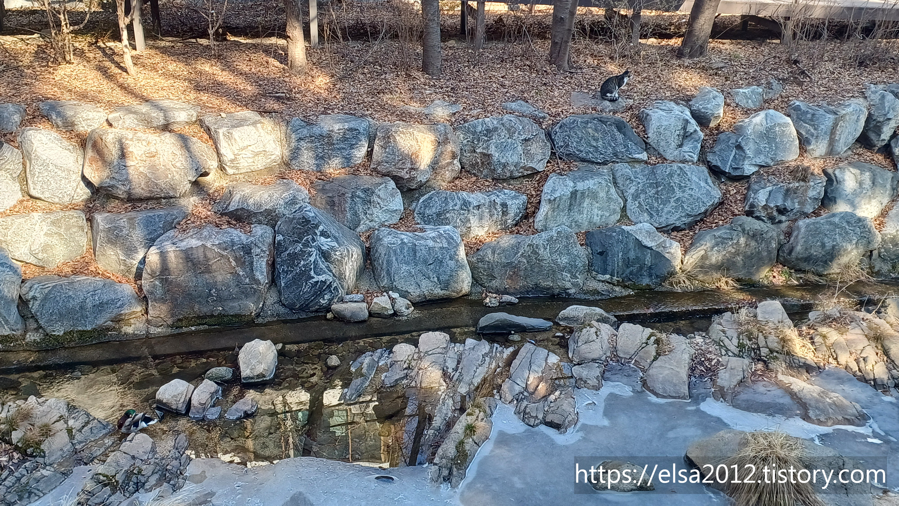 길냥이 한 마리가 천둥오리를 노리는 것인지.. 아니면 친구를 삼으려는 것인지 가까이 있네요.