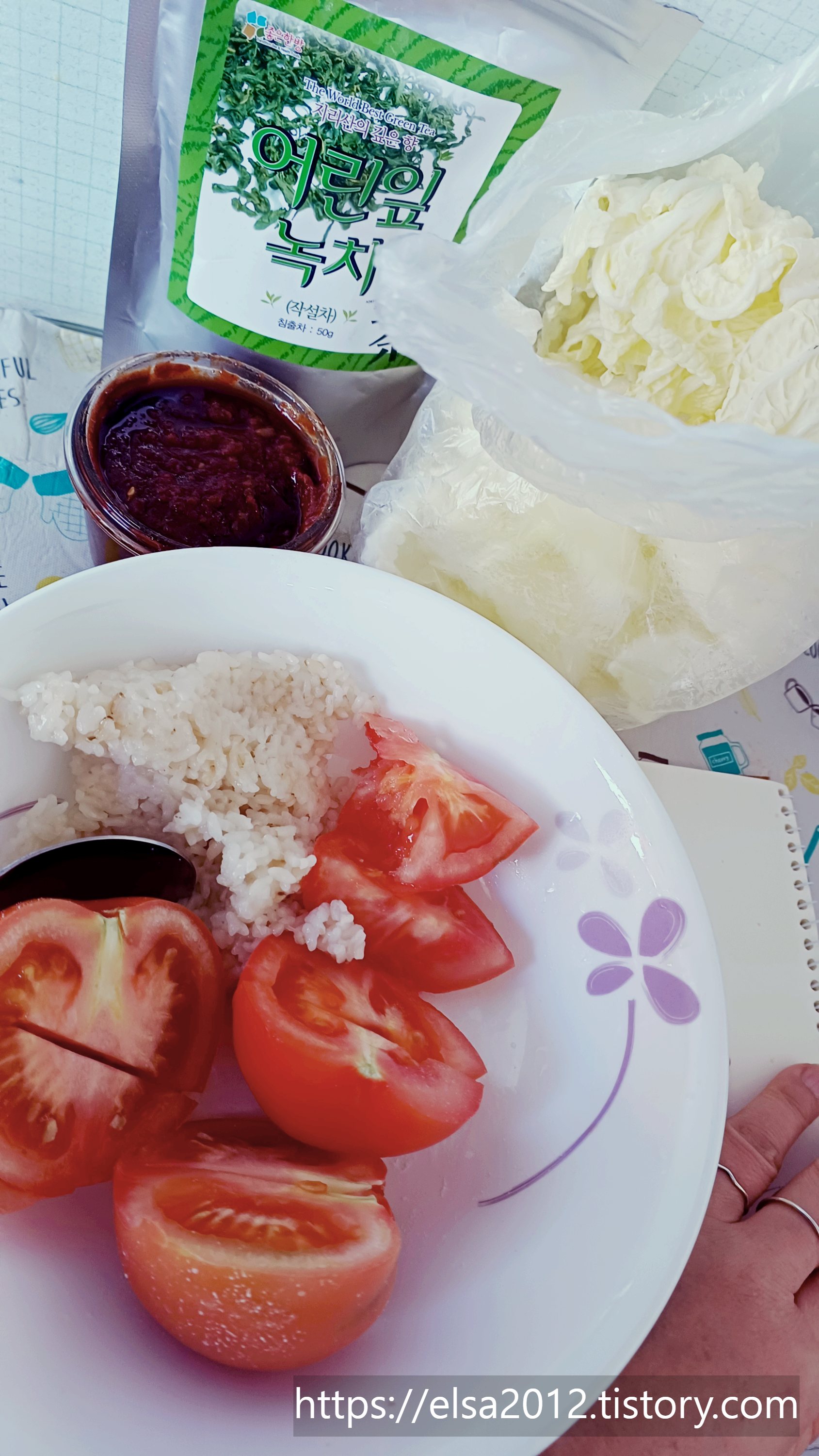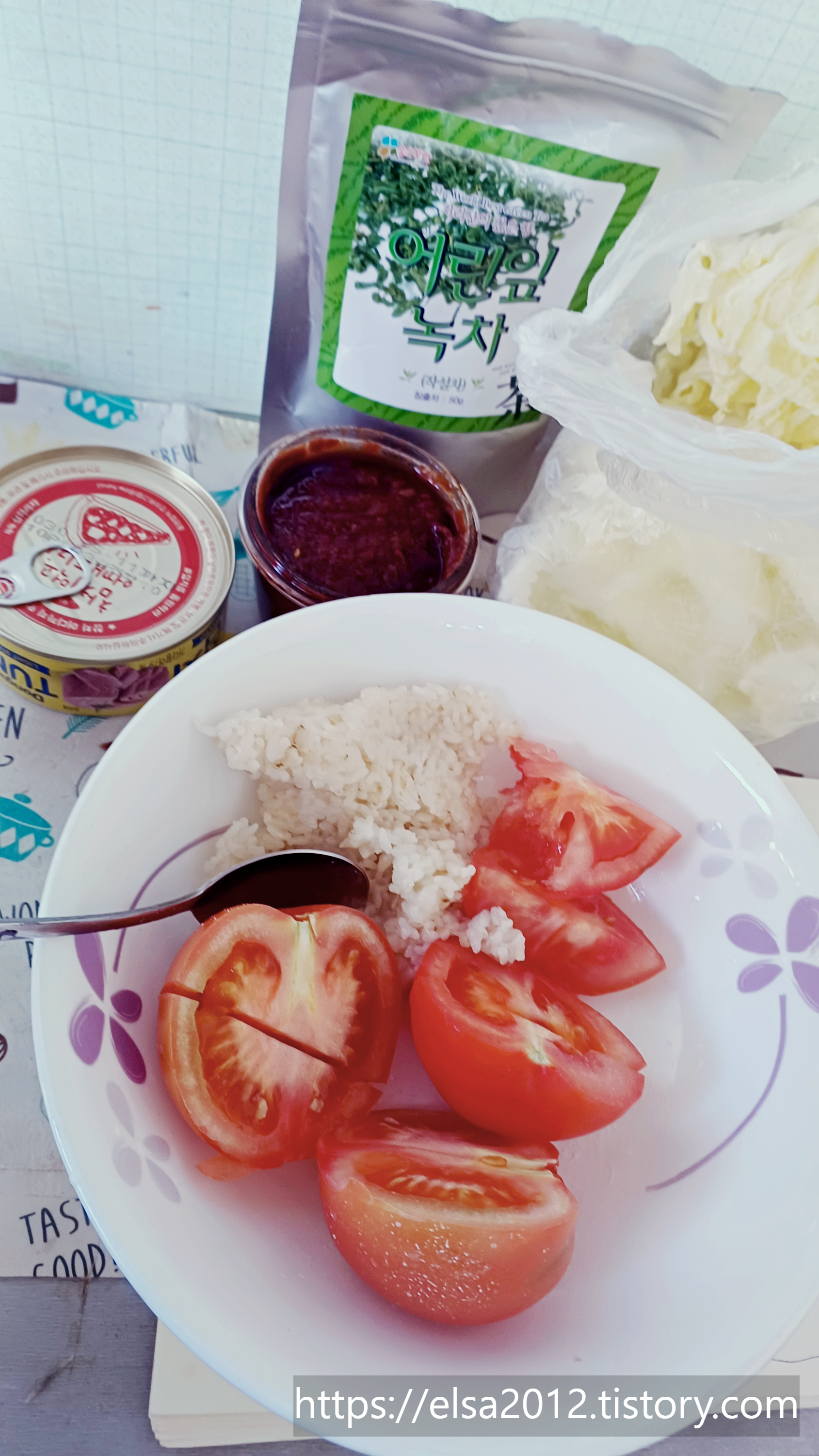 이날은 알배추 씻어서 담아와서 고추장 찍어먹고 이렇게 토마토와 참치를 먹었습니다.