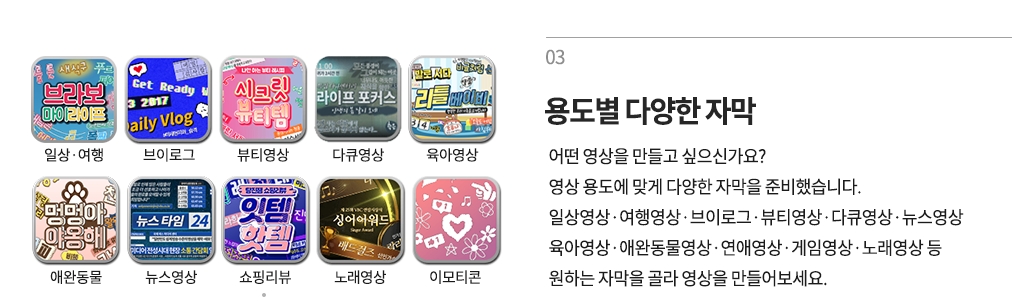 아이콘들로 빠르게 작업 가능 자막을 쉽게 넣고 수정할 수 있습니다. 자막에 애니메이션과 효과음을 지원가능. 결과물 화질을 HD (1920*1080) 까지 선택 가능. 포멧의 영상과 사진파일을 첨부 가능