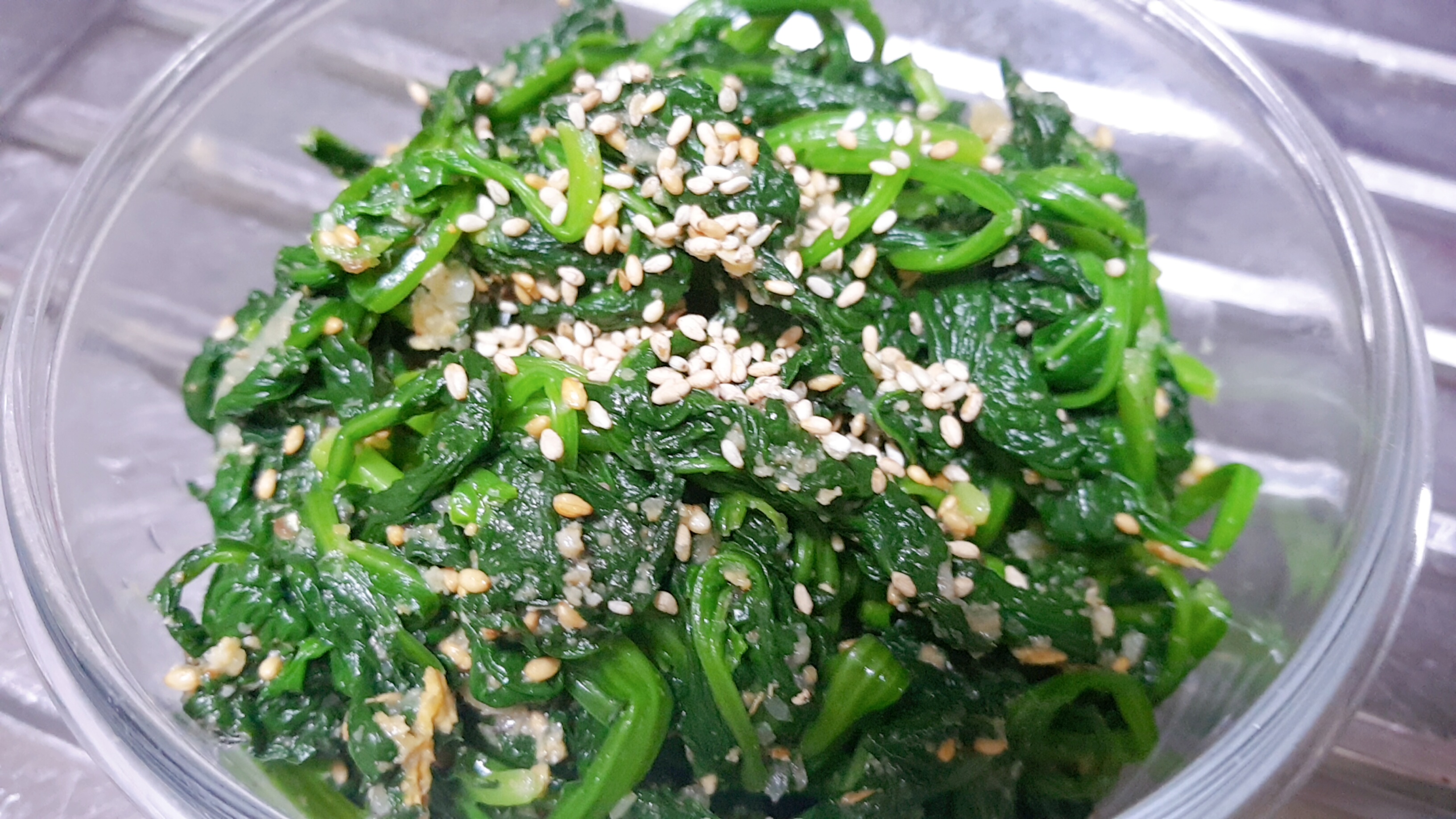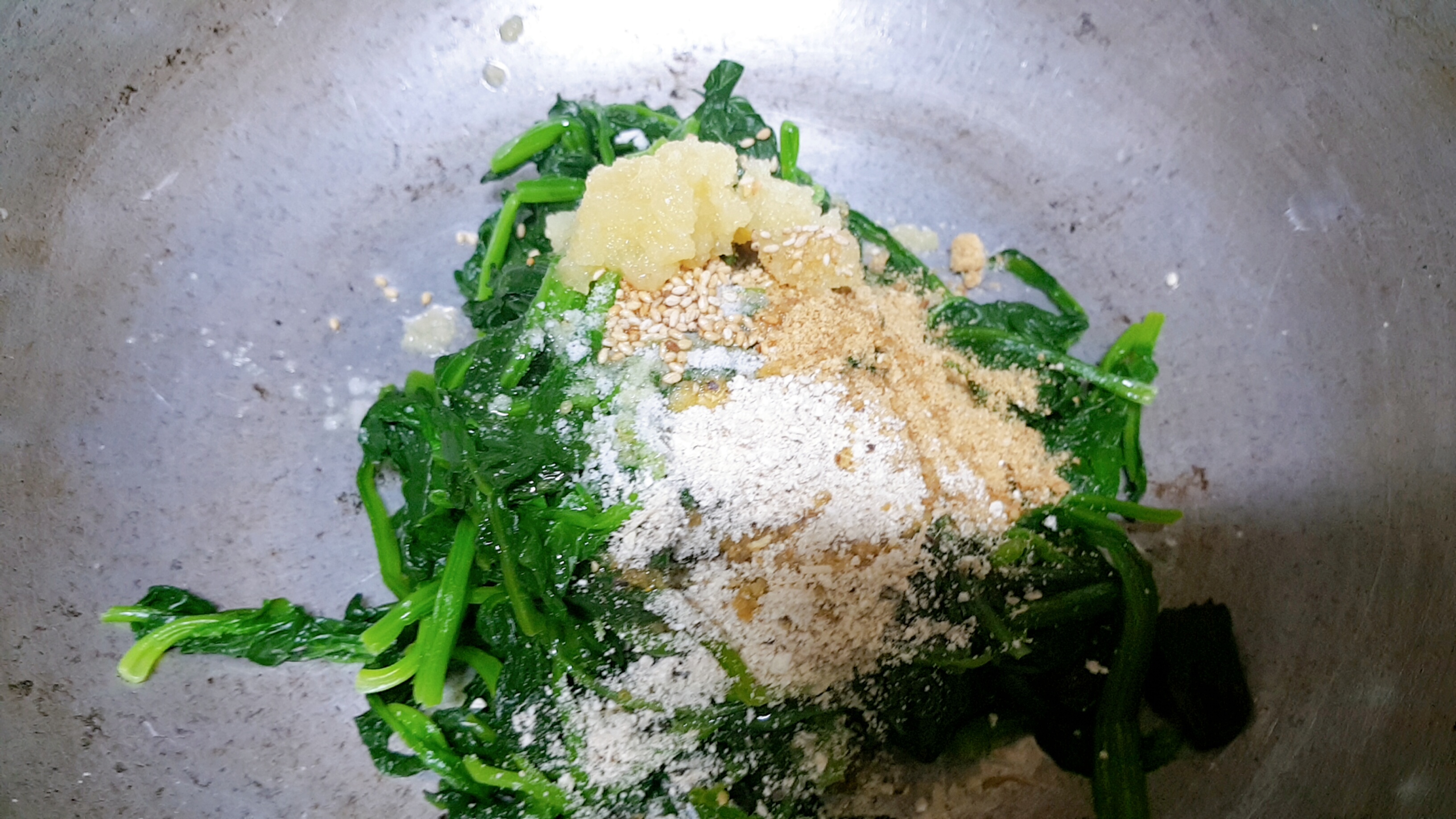 그리고 역시 손질 후 살짝 데친 시금치를 같은 재료를 넣고 조물조물 무쳤습니다.