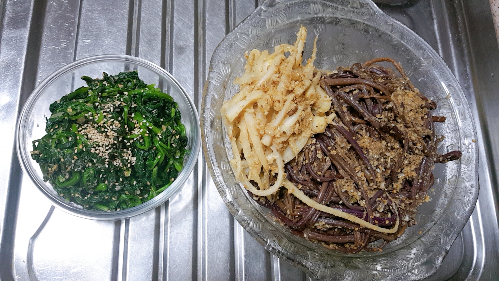 추석 차레 음식으로 삼색 나물을 만들었습니다. 고사리나물 볶음, 도라지나물 볶음, 시금치나물 무침
