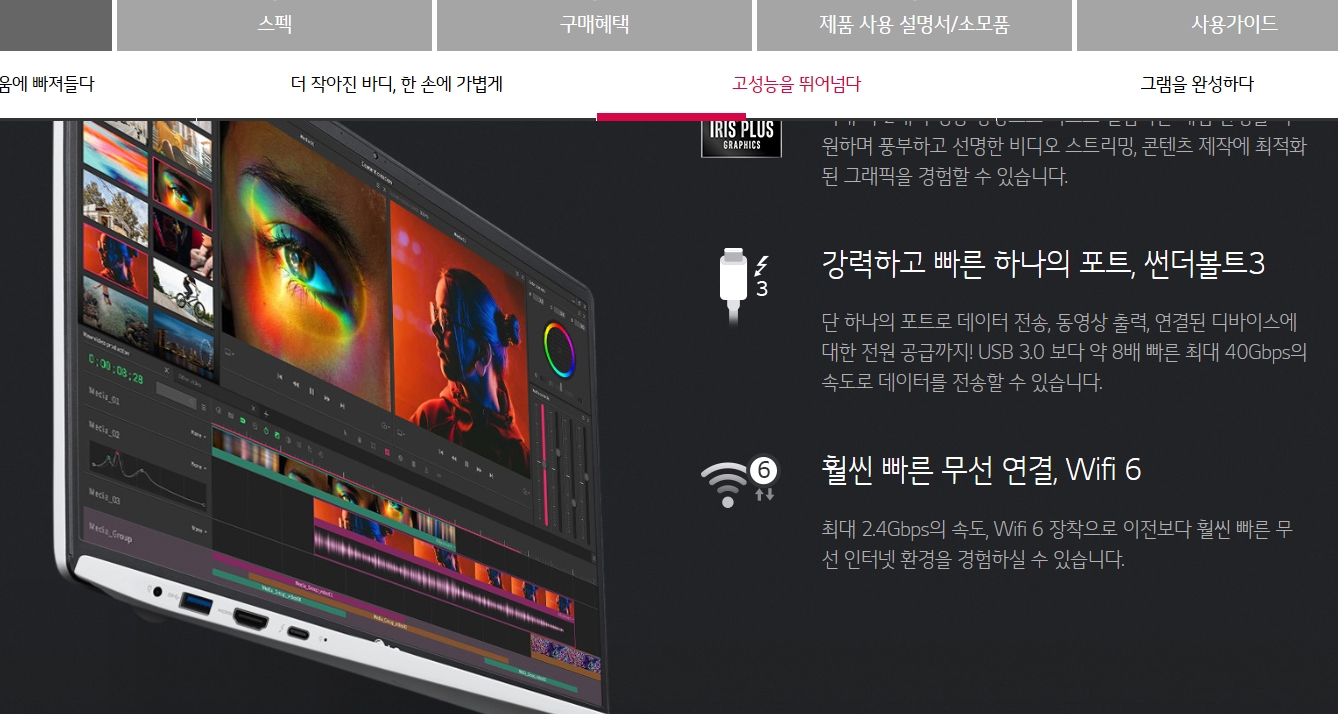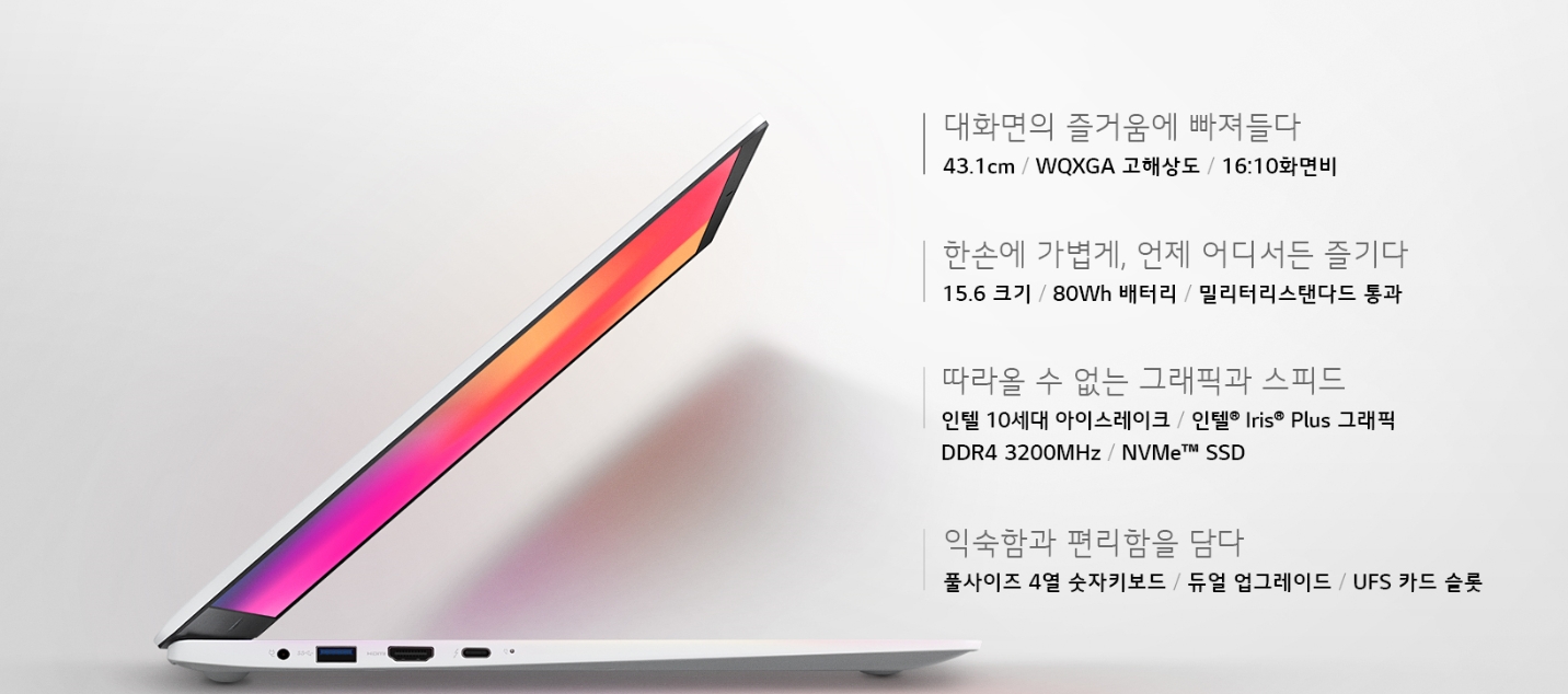 스펙 요약정보 Windows 10 Home (64비트) 헤드폰 출력, USB 3.1 (x3), USB Type-C™ (USB 3.1, x1), HDMI, Thunderbolt™ 3(over USB Type-C Port), DC-in 리튬 이온 배터리 (80Wh) 256 GB (M.2, NVMe™) + 확장 슬롯1 10세대 인텔® 코어™ i5-1035G7 프로세서 화면크기43.1cm 백라이트 키보드 풀 사이즈 100 키 (4열 숫자 전용키 포함) |