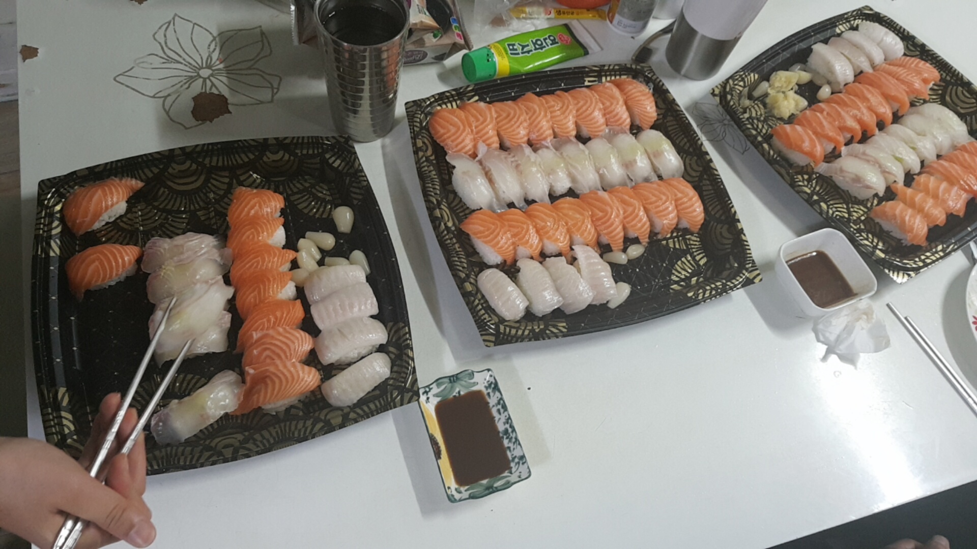 전 개인적으론 연어초밥을 가장 좋아하는데~ 한치와 광어등등도 물론 좋아하네요!