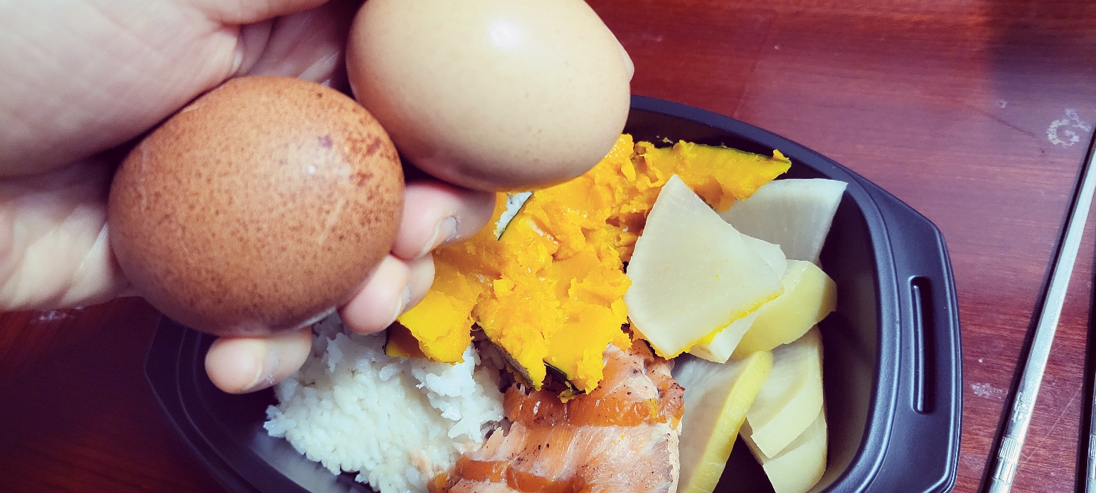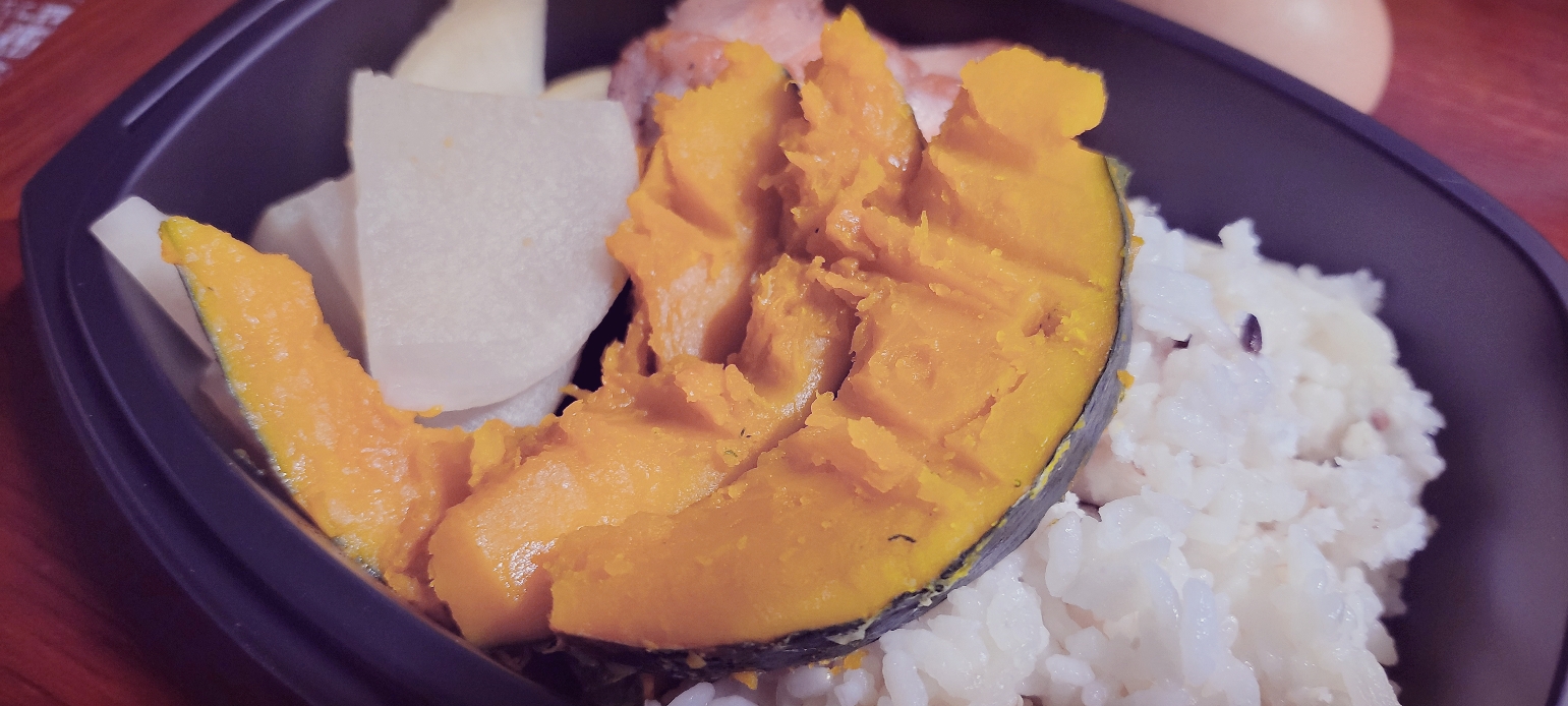 삶은 계란 2개, 찐 단호박, 절임무, 훈제연어.밥