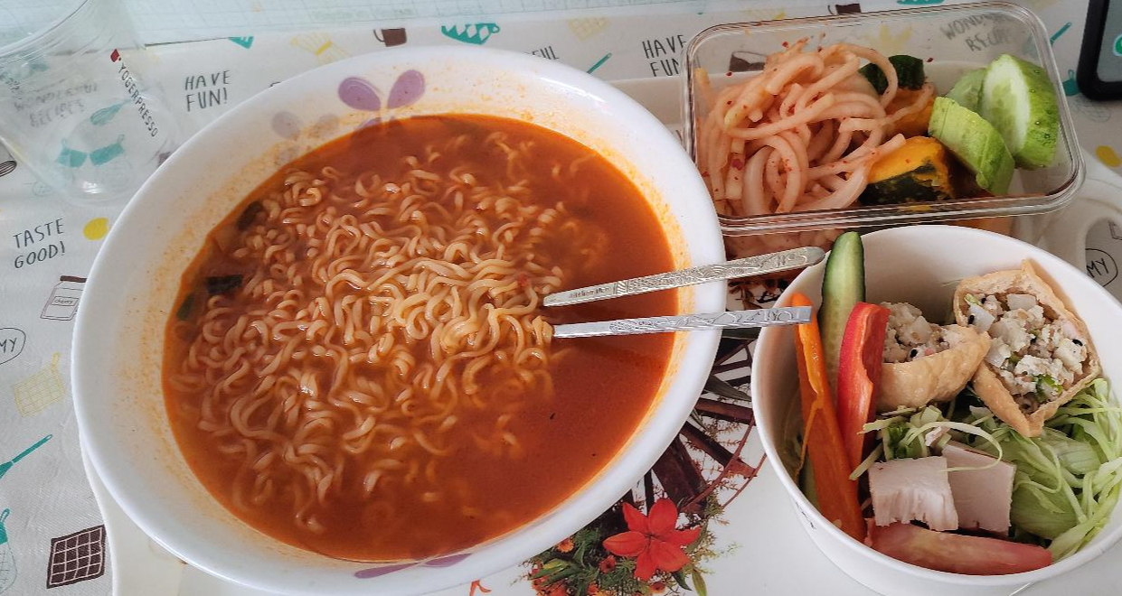 양배추 샐러드와 파프리카와 라면, 두부유부초밥,