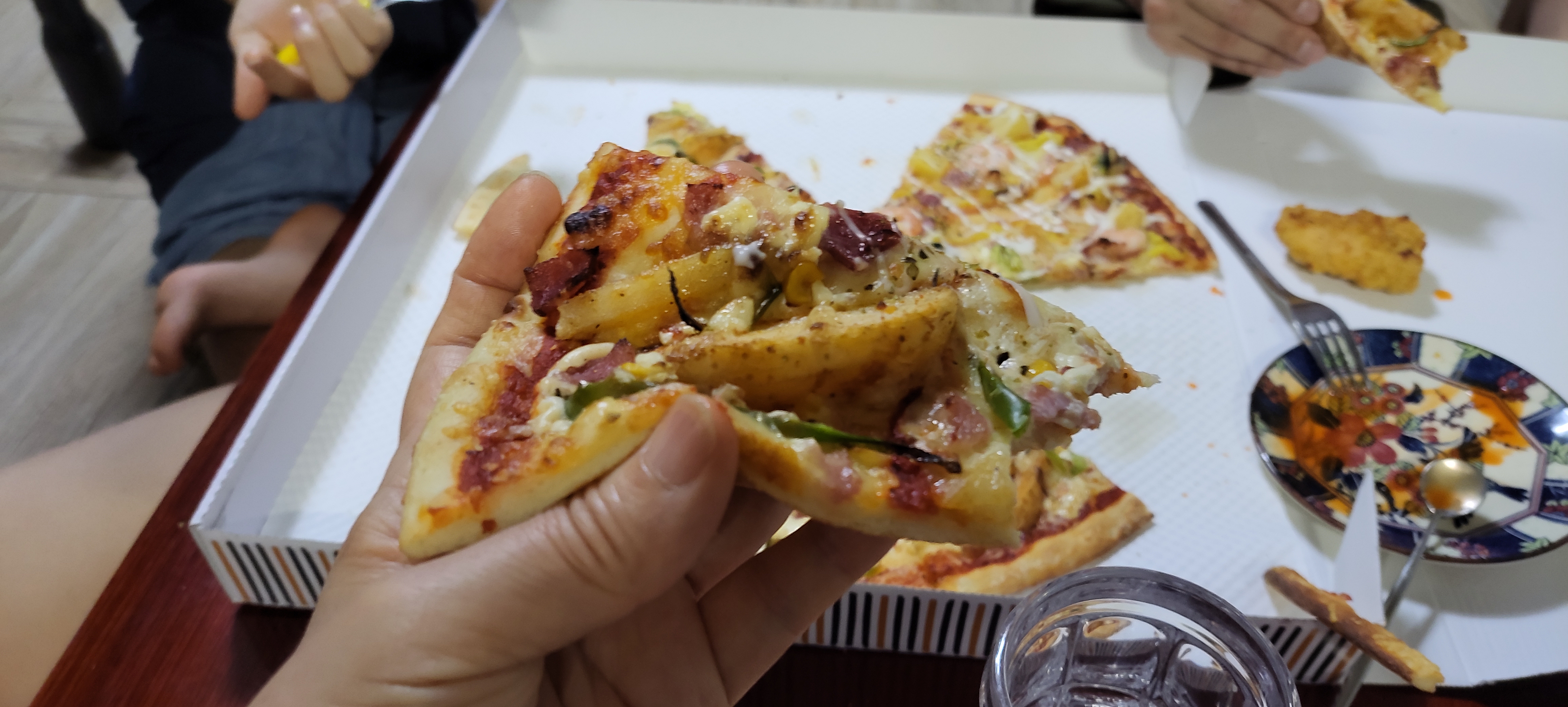 식탁을 치워버리고 이렇게 좌식으로 앉아서 먹는 것도 좋은데 어디선가 무릎에 안 좋다고도 하던데..어쨋든 먹을때는 조용히 샤샥! ~ 엿시 새우랑 감자가 들어간 피자는 절대 양보 못합니다. 이 재료만큼은 꼭 들어가야 한다는것!