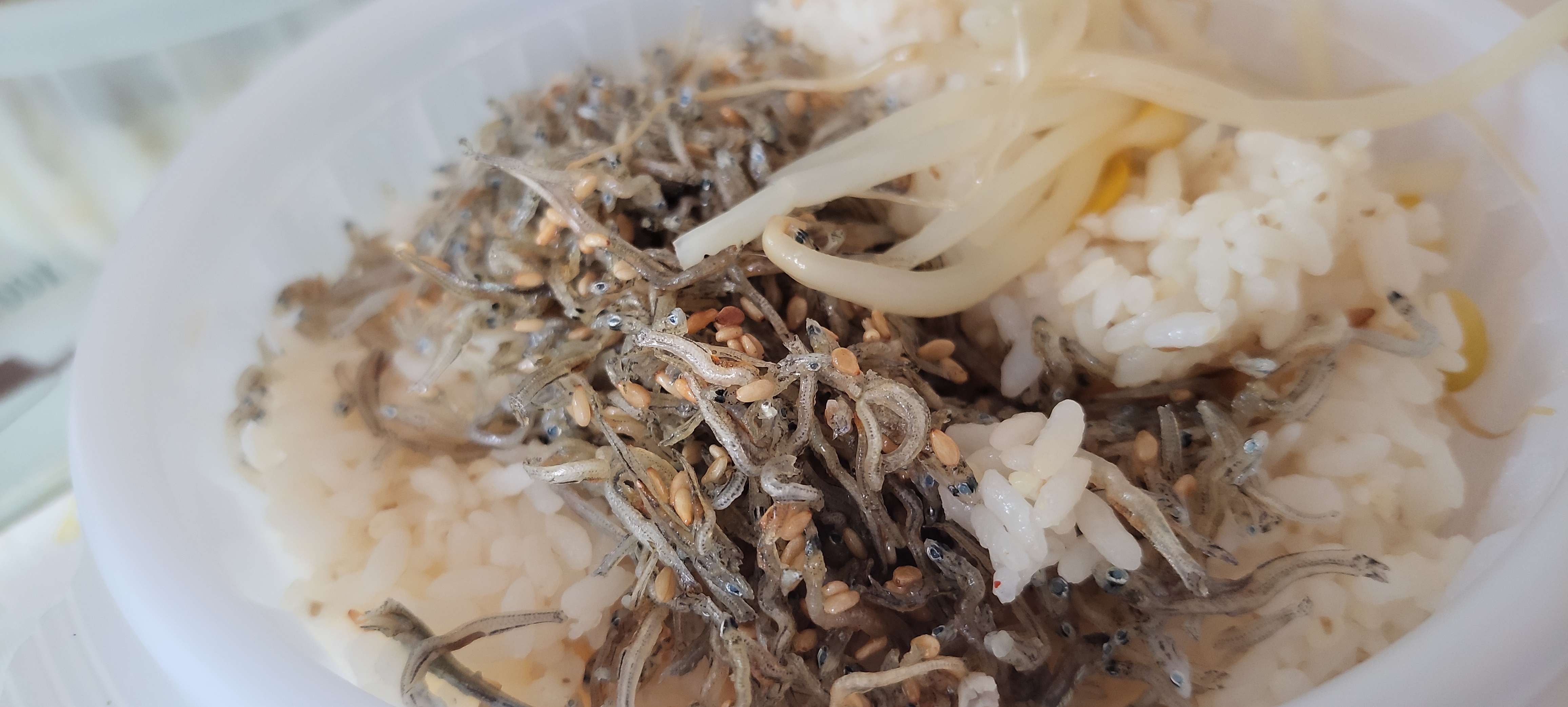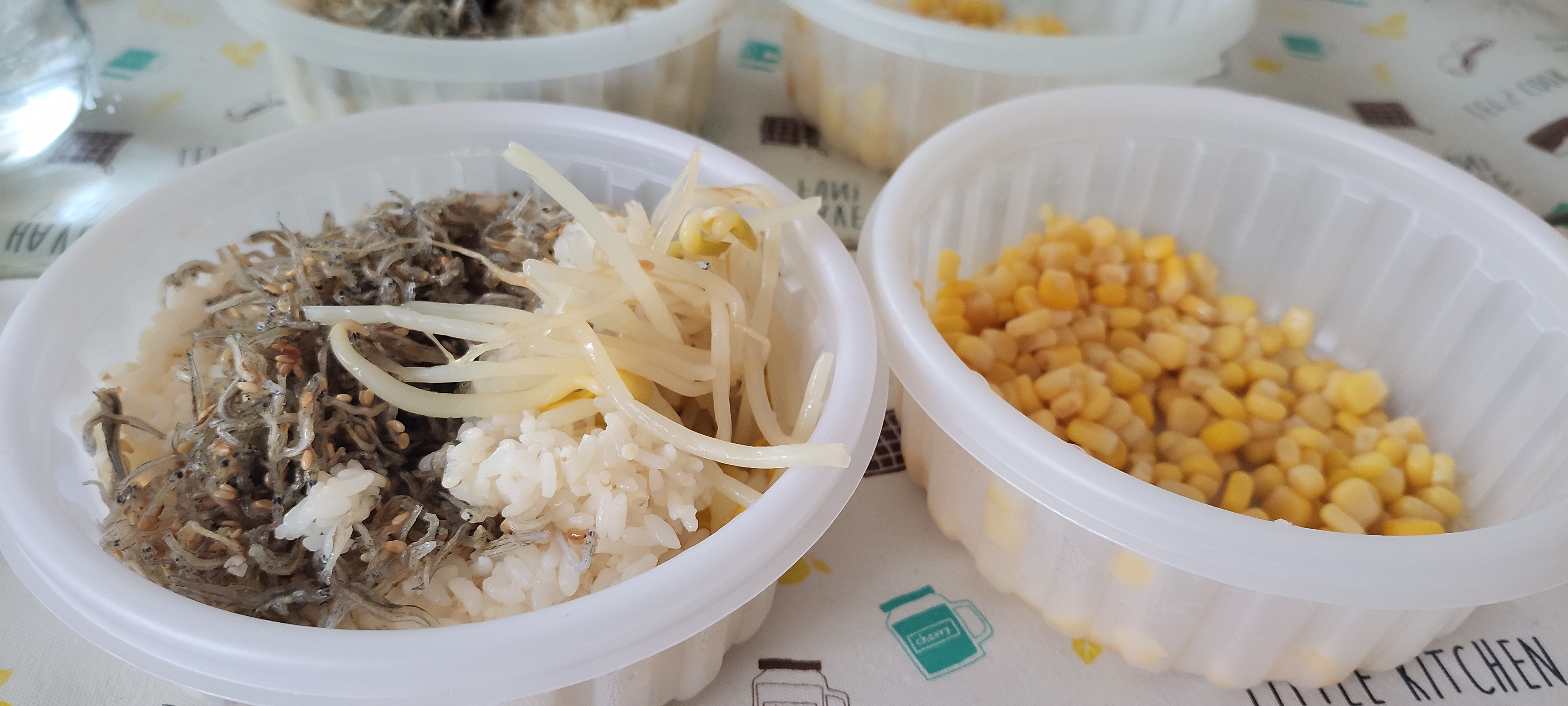 옥수수 콘, 콩나물국에서 내용물만~ 멸치볶음 ,라면